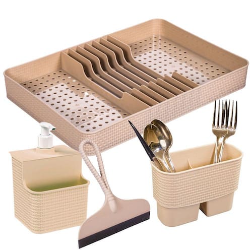 Todos os produtos deste kit são da mesma linha, cor e textura, proporcionando uma harmonia visual única na sua pia. São fabricados com plástico resistente, garantindo durabilidade e qualidade.