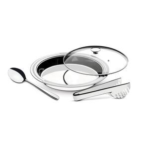 - Peças totalmente feitas de aço inox, por isso não soltam nenhum resíduo nos alimentos, mantendo-os saudáveis. - Altamente duráveis mantêm suas características originais, preservando a beleza, a higiene e a durabilidade do material. - Beleza e praticidade em seu design. Ideal para servir à mesa. - Acabamento em brilho, com detalhes em alto relevo nas bordas. - Com tampa de vidro mantém os alimentos quentes por mais tempo. - Higiênicas e de fácil limpeza. - Podem ser lavadas diariamente na máquina de lavar louça