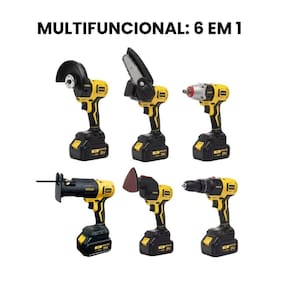 Conteúdo da Embalagem: - 01 Ferramenta/Corpo Principal. - 01 Cabeça de Conversão da Furadeira/Parafusadeira. - 01 Cabeça de Conversão da Serra Corrente. - 01 Cabeça de Conversão da Serra Tico-Tico. - 01 Cabeça de Conversão da Esmerilhadeira Angular. - 01 Cabeça de Conversão da Chave de Impacto. - 01 Cabeça de Conversão Multifuncional. - 04 Lixas; - 01 Chave Dupla Fenda e Philips. - 02 Baterias 21 Volts. - 01 Carregador para Bateria. - 01 Maleta. - 01 Manual do Usuário. Marca: Não Informado