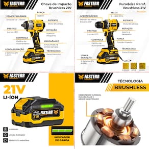 Domine qualquer projeto com o Kit 2 Ferramentas Brushless 21V FST002K da Fasterr. Combinando a versatilidade de uma parafusadeira de impacto com a potência bruta de uma chave de impacto, este kit é a solução ideal para quem busca eficiência, durabilidade e resultados profissionais. Projetado com a tecnologia de ponta brushless, ele oferece máximo rendimento e autonomia para diversos trabalhos, tudo em um conjunto portátil e completo!
