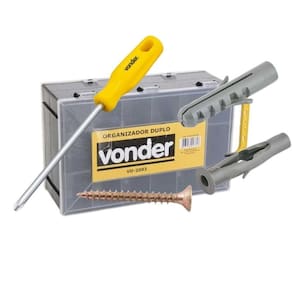 Descrição Descrição: Kit Parafuso Chipboard com maleta organizadora plástica dupla VD 2003 VONDER. Acompanha bucha plástica para tijolo vazado, bucha plástica de fixação + parafusos madeira chipboard, cabeça chata, fenda cruzada/phillips Vonder + 1 Chave Philips - Parafusos Possui acabamento bicromatizado, que aumenta a resistência contra corrosão/oxidação, além de cabeça tipo phillips, que proporciona maior força de aperto e menor possibilidade da chave ou bits escapar e riscar a peça que está sendo trabalhada.Indicado para fixações em madeiras e derivados, como: aglomerados, pínus e MDF. Pode ser utilizado também em alvenaria com o auxílio de uma bucha para tijolo vazado, que acompanha o kit. Conhecido como parafuso CHIPBOARD. devido a sua rosca com filetes espaçados e ângulo agudo, permite a aplicação sem a necessidade de pré furo - Bucha Bucha plástica de fixação - Excelente elasticidade, amortecendo vibrações. Indicada para fixações em concreto e alvenaria. Bucha plástica para tijolo vazado -Fabricadas em plástico de elevada qualidade, garantindo uma instalação segura e fixação de qualidade. Indicada para fixações em tijolo vazado/oco. - Organizador plástico duplo, VD 2003, VONDER Organizador plástico. Duplo, com duas tampas e divisórias removíveis e adaptáveis. Indicado para organizar e armazenar peças e acessórios em geral. - Conteúdo da maleta organizadora: Parafusos 100 Peças - Parafuso Para Madeira 3,5 X 14mm Cabeça Chata Bicromatizado 100 Peças - Parafuso Para Madeira 4,0 X 25mm Cabeça Chata Bicromatizado 100 Peças - Parafuso Para Madeira 4,0 X 35mm Cabeça Chata Bicromatizado 100 Peças - Parafuso Para Madeira 4,0 X 40mm Cabeça Chata Bicromatizado 050 Peças - Parafuso Para Madeira 4,0 X 45mm Cabeça Chata Bicromatizado 050 Peças - Parafuso Para Madeira 6,0 X 40mm Cabeça Chata Bicromatizado
