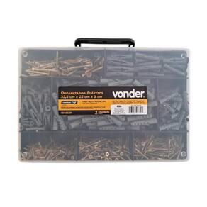 Descrição Descrição: Kit Parafuso Chipboard com maleta organizadora plástica VD 8020 VONDER. Acompanha bucha plástica para tijolo vazado, bucha plástica de fixação + parafusos madeira chipboard, cabeça chata, fenda cruzada/phillips Vonder. - Parafusos Possui acabamento bicromatizado, que aumenta a resistência contra corrosão/oxidação, além de cabeça tipo phillips, que proporciona maior força de aperto e menor possibilidade da chave ou bits escapar e riscar a peça que está sendo trabalhada. Indicado para fixações em madeiras e derivados, como: aglomerados, pínus e MDF. Pode ser utilizado também em alvenaria com o auxílio de uma bucha para tijolo vazado, que acompanha o kit. Conhecido como parafuso CHIPBOARD. Devido a sua rosca com filetes espaçados e ângulo agudo, permite a aplicação sem a necessidade de pré furo - Bucha Bucha plástica de fixação - Excelente elasticidade, amortecendo vibrações. Indicada para fixações em concreto e alvenaria. Bucha plástica para tijolo vazado -Fabricadas em plástico de elevada qualidade, garantindo uma instalação segura e fixação de qualidade. Indicada para fixações em tijolo vazado/oco. - Organizador plástico duplo, VD 8020, VONDER legal: 90 dias Detalhes TécnicosModelo: VD 8020 Material:Polipropileno Comprimento:325 mm Largura:220 mm Altura:50 mm Capacidade de carga kgf :2 kgf Cor do organizador para ferramentas:Preto e transparente Massa aproximada peso :0,4 kg - Conteúdo da maleta organizadora: Parafusos 100 Peças - Parafuso Para Madeira 4,0 X 25mm Cabeça Chata Bicromatizado 100 Peças - Parafuso Para Madeira 4,0 X 35mm Cabeça Chata Bicromatizado 100 Peças - Parafuso Para Madeira 4,0 X 40mm Cabeça Chata Bicromatizado 050 Peças - Parafuso Para Madeira 4,0 X 45mm Cabeça Chata Bicromatizado 050 Peças - Parafuso Para Madeira 6,0 X 40mm Cabeça Chata Bicromatizado Buchas 50 Peças - Bucha Plástica F-06 - 6mm 50 Peças - Bucha Plástica F-08 - 8mm 050 Peças - Bucha Plástica F-10 - 10mm 050 Peças - Bucha plástica para tijolo vazado VR6 - 6mm 050 Peças - Bucha plástica para tijolo vazado VR8 - 8mm 050 Peças - Bucha plástica para tijolo vazado VR10 - 10mm Quantidade Peças Total do KIT: 700 peças Material Parafuso: Aço Carbono Material Bucha: Plástica Uso: Marca: Não Informado Ean: 7908481208409