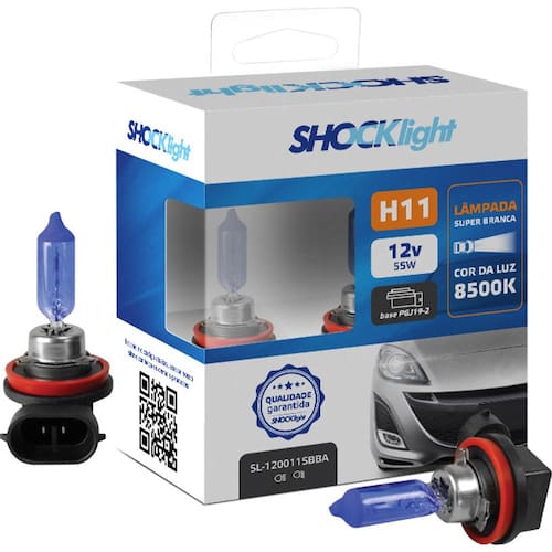 - 1 par de lâmpadas super brancas H11 para carrosEssas lâmpadas super brancas H11 dão um ótimo efeito estético com sua iluminação mais branca que as lâmpadas autênticos assim proporcionando maior segurança ao dirigir de noiteA fabricação dessas lâmpadas super brancas é feita com vidro em quartzo que aumenta a resistência térmica e dá maior durabilidade e vida útil para as lâmpadas. Em sua composição é acrescida a proteção UV que éTecnologia super branca, luz mais branca e maior facho de luz, bulbo de vidro na cor azul para melhor aparência. Com proteção UV.O efeito estético causado com as lâmpadas super brancas de 8500k vão te surpreender.Kit com 2 lâmpadas H11 de 8500k 12v 55w na cor branca e um par de pingo W5W 12v também na cor branca para combinar com seu farolAtenção: H11 é o tipo de encaixe que a lâmpada tem no farol, ou seja, o modelo do plug, confirme o modelo de lâmpada de seu carro caso não tenha certeza! FICHA TÉCNICA:MODELO: SB H11 8500KPOTÊNCIA: 55WALIMENTAÇÃO: 12VTECNOLOGÍA: HALÓGENA SUPER BRANCAENCAIXE: H11BASE: PGJ19-2CONEXÃO: Conector em LPROTEÇÃO UV: SIM