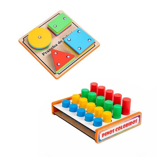 Kit Pedagógico Prancha de Seleção e Pinos Coloridos Encaixe Kit Pedagógico Prancha de Seleção e Pinos Coloridos Encaixe Prancha de Seleção Brinquedo Educativo Pedagógico em MDF Desenvolve o aprendizado das formas geométricas e das cores, além da diferença dos encaixes. Primeiro deixe a criança manipular as peças de maneira aleatória, com o passar do tempo comece a ensiná-la, separar as cores e formas iguais. Ao encaixar as peças no tabuleiro, poderá ser observada duas maneiras de organizá-las. Uma delas é pedir que a criança encaixe todas as peças de cores iguais na mesma posição. A outra é colocar as peças de maneira que as cores iguais nunca estejam na mesma posição. Outras formas de brincar poderão ser criadas, deixe a criança usar de criatividade e descobrir por si mesma. - Material: MDF- Produto Lacrado- Faixa etária: a partir de 2 anos- excelente acabamento- Contém: 01 tabuleiro e 16 peças- Dimensões: 21x21x4cm- Peso: 0,600 gramas- Garantia: 90 dias- Certificado INMETRO CE-BRI/BRICS 0001-13 NM 300/2002 Segurança do Brinquedo Pinos Coloridos Brinquedo Educativo Pedagógico em MDF No início, deixe a criança brincar apenas retirando e colocando os pinos no tabuleiro, sem cobrar da mesma a classificação de tamanhos e cores. Com o passar do tempo comece a mostrá-la que essa classificação pode ser feita, fazendo assim que ela tome um maior interesse pelo brinquedo.Empilhar um pino sobre o outro tentando fazer uma torre bem alta, também faz parte da brincadeira.Trabalha a coordenação viso-motora, cores, tamanhos, quantidade, formas e memorização. -marca: Tralalá-material: MDF-produto Lacrado-faixa etária: a partir de 2 anos-excelente acabamento-contém: 01 tabuleiro e 16 peças-dimensões: 22x18x9cm-peso: 0,550 gramas-garantia: 90 dias- certificado INMETRO CE-BRI/OCP 0019 nº 10421 NM 300/2002 Segurança do BrinquedoHomologação Inmetro: ITAC-OCP-0019/2021 Marca: Tralalá