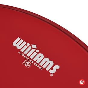 Vermelha coated 2-Ply Dupla Porosa Pele dupla e porosa com filme duplo 10 mil de espessura cada filme Porosidade com acabamento preto Possui óleo entre as peles, no formato de pele hidráulica Boa durabilidade com excelente controle de harmônicos e ressonância Semelhante a Remo Pinstripe Coated e Evans Hydraulic Coated acessíveis Williams é uma marca brasileira de peles importadas Pele acessível com bom custo x benefício