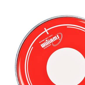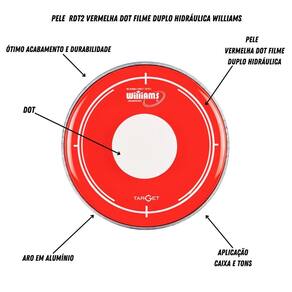 7 Peles RDT2 Vermelha Dot Filme Duplo Hidráulica Williams Pele de filme duplo VERMELHA transparente com óleo e Dot Espessura: 7 mil milésimo de polegada ou 0.188mm cada filme Pele com bola branca central indicada Focada em um som de frequências intermediárias, com ataque definido, Controle de harmônicos e excelente durabilidade