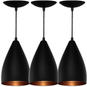 As especificações técnicas do Pendente Vegas Kit 3 Luminárias Preto e Bronze são: - Produto: Kit Pendentes; - Material: Alumínio; - Conteúdo: 3 unidades; - Indicação: Iluminação e decoração; - Alimentação: Bivolt; - Tipo de lâmpada: 1 x E-27 não inclusas ; - Dimensões aproximadas do produto: 18,5 x 14cm; - Comprimento do cabo: 1m ajustável ; - Material do cabo: PP.