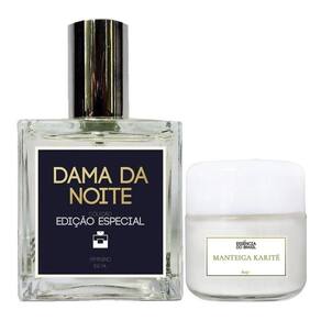 Kit Perfume Dama da Noite 100ml + Manteiga de Karité 60grSinta a sensação de bem-estar ao usar nossos perfumes elaborados diretamente com óleos essenciais, aproximando você da natureza. Um perfume que marca a presença de quem usa, afeta a autoestima com boa fixação. Certamente um produto de qualidade, que desperta o sentido, agrada a todos e vale o valor que custa.Família Olfativa Dama da Noite: FloralOriginária da América do Sul, América Central e América do Norte, prefere climas tropicais e subtropicais. Ganhou destaque e passou a ser conhecida principalmente pela sua forma bela e seu aroma inconfundível. De acordo com contos populares, ela é capaz de realizar desejos caso o pedido tenha sido feito durante o pedido de sua floração. Carregando consigo cores elegantes, ela é o necessário para a construção de um bom perfume: o melhor das essências. A dama da noite sempre será só uma, e agora, além dela... Você.Manteiga de Karité 60grNome científico - Butyrospermum Parkii Shea Butter Origem: ÁfricaMétodo de processamento - prensado a frioUma gordura da semente que vem da árvore de karité encontrada na África, possui excelentes benefícios como:Hidratante para peleReduz InflamaçãoSuaviza a peleDurante a gestaçãoMelhora a elasticidade da peleTrata acne e manchasUm excelente hidratante natural com diversas propriedades, que se tornou popular entre homens e mulheres.MODO DE USO:Pode ser utilizada pura, diretamente na pele e cabelos ou adicionada aos cremes e máscaras capilares.Precauções: Uso cosmético. Em caso de irritação suspenda o uso.Um toque único e especialNossos produtos são embalados com música clássica Marca: Essência Do Brasil