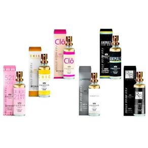 As fragrâncias femininas do kit são o Chic Woman, o 521 Vip Rose e o Clo. Já as fragrâncias masculinas são o Animals, o Imortal e o RB. Você também tem a opção de trocar qualquer uma das fragrâncias disponíveis em estoque, basta consultar a nossa equipe.