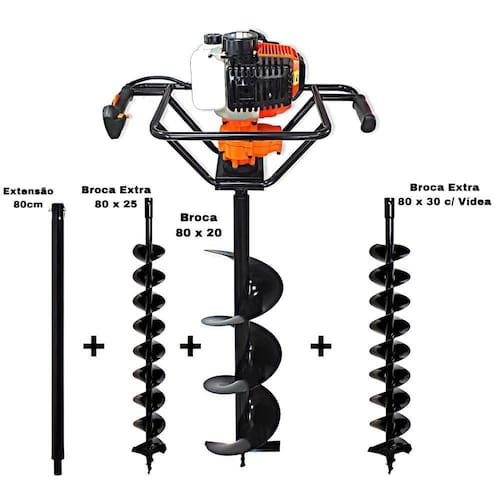 Apresentação:Em uma Caixa 40x60x34cm contendo 01 Motor do Perfurador, 01 Dosador de Combustível, 01 Chave de Vela,02 Chaves Allen, 01 Chave de Boca e Manual do produto. Em uma caixa 20x21x80cm contendo 01 Broca80 x20cm com Pino Trava e Grampo+ Com Broca 30X80CM C/ Vídea + Broca 25X80 C/ Vídea + Extensão CCM 80cm