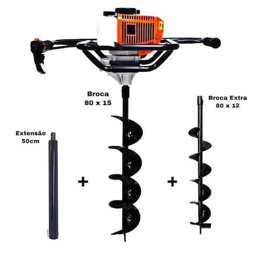 Em uma Caixa 40x60x34cm contendo 01 Motor do Perfurador, 01 Dosador de Combustível, 01 Chave de Vela, 02 Chaves Allen, 01 Chave de Boca e Manual do produto. Em uma caixa 20x21x80cm contendo 01 Broca 80 x15cm com Pino Trava e Grampo+ Broca Extra 80x12cm +Extensão