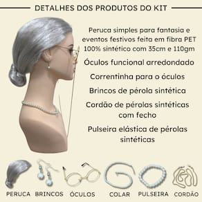- Fibra kanekalon pet; - 35cm de comprimento; - Modelo Wig Tradicional; - Temperatura máxima aceita 130º ; - Tamanho da peruca M (Produto flexível); - 110 gramas em média;- Kit completo com peruca, brincos, óculos, cordão, colar e pulseira.