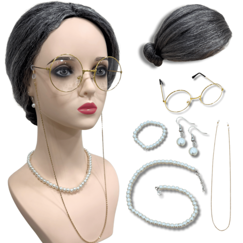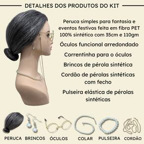 - Fibra kanekalon pet; - 35cm de comprimento; - Modelo Wig Tradicional; - Temperatura máxima aceita 130º ; - Tamanho da peruca M (Produto flexível); - 110 gramas em média;- Kit completo com peruca, brincos, óculos, cordão, colar e pulseira.