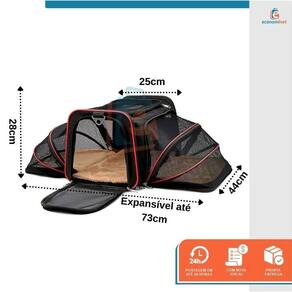 Características do Produto: - Confeccionada nas especificações para embarque na cabine de aviões da maioria das companhias aeras. - Acomoda confortavelmente pets de até 14 kg; - Aberturas frontal e lateral que facilitam a entrada e saída do Pet; - Fundo interno rígido removível, fácil de higienizar; - Alta qualidade de fabricação e detalhe; - Super arejada, confeccionada com tela de alta resistência nas laterais e topo; - Totalmente dobrável e fácil de guardar.