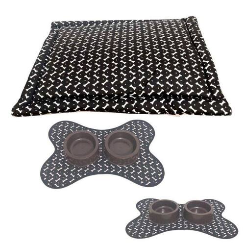 Kit Pet Preto - 4 peças colchonete, tapete, comedouro e bebedouro Kit acompanha: Colchonete preto tamanho M: Comprimento: 52 cm Largura: 70 cm Altura: 7 cm Tecido gorgurinho; Estampa preto Enchimento de manta acrilica; Com costura reforçada; Totalmente lavável; Tapete pet para comedouro e bebedouro na cor preto 22 cm comprimento 16 cm de largura. Comedouro e bebedouro 500 ml na cor preto.