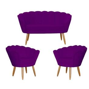 Kit Pétala Namoradeira e 2 Poltronas Decorativa Pés Palito Veludo Roxo - LM DECOR
