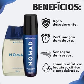 O Kit Phytoderm Nomad é ideal para quem busca liberdade, aventura e sofisticação em uma fragrância marcante. Composto por uma Deo Colônia de 100ml e um Body Spray de 120ml, este kit oferece praticidade e versatilidade, perfeito para acompanhar você em todos os momentos do dia.