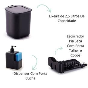 Kit pia compacto escorredor 4 pratos dispenser lixeira 2,5l cor preto ========== sobre o produto ========== O kit para pia da dasplast é composto por 3 peças, sendo ideal para proporcionar praticidade e organização para sua cozinha. Este conjunto inclui um escorredor slim com capacidade para 4 pratos, copos e talheres, e conta com um escorredor de água integrado para manter a pia seca e limpa após a lavagem da louça. O kit também possui uma lixeira de 2,5 litros, adequada para descartar pequenos resíduos durante o preparo das refeições, otimizando o espaço na bancada. Para auxiliar nas tarefas diárias, o kit é equipado com um dispenser de detergente, facilitando o armazenamento e o acesso ao detergente para a lavagem da louça de maneira eficaz. Fabricado com material de alta qualidade, o kit oferece durabilidade e resistência. Disponível nas cores branca e preta, o kit para pia da dasplast se harmoniza com diversos estilos de cozinha, contribuindo com um toque de sofisticação ao espaço. ========== ficha técnica ========== Medidas: 27 x 17,5 x 17 cm Cor: branca Capacidade do escorredor: 4 pratos, talheres e copos. Capacidade da lixeira: 2,5l Capacidade do dispenser: 500ml P: o produto é novo ou Marca: Não Informado