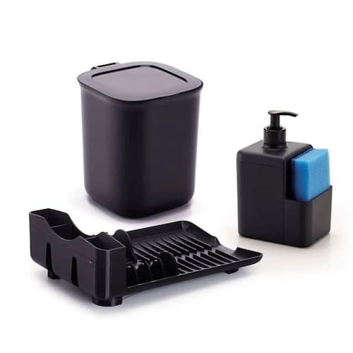 Kit pia compacto escorredor 4 pratos dispenser lixeira 2,5l cor preto ========== sobre o produto ========== O kit para pia da dasplast é composto por 3 peças, sendo ideal para proporcionar praticidade e organização para sua cozinha. Este conjunto inclui um escorredor slim com capacidade para 4 pratos, copos e talheres, e conta com um escorredor de água integrado para manter a pia seca e limpa após a lavagem da louça. O kit também possui uma lixeira de 2,5 litros, adequada para descartar pequenos resíduos durante o preparo das refeições, otimizando o espaço na bancada. Para auxiliar nas tarefas diárias, o kit é equipado com um dispenser de detergente, facilitando o armazenamento e o acesso ao detergente para a lavagem da louça de maneira eficaz. Fabricado com material de alta qualidade, o kit oferece durabilidade e resistência. Disponível nas cores branca e preta, o kit para pia da dasplast se harmoniza com diversos estilos de cozinha, contribuindo com um toque de sofisticação ao espaço. ========== ficha técnica ========== Medidas: 27 x 17,5 x 17 cm Cor: branca Capacidade do escorredor: 4 pratos, talheres e copos. Capacidade da lixeira: 2,5l Capacidade do dispenser: 500ml P: o produto é novo ou Marca: Não Informado