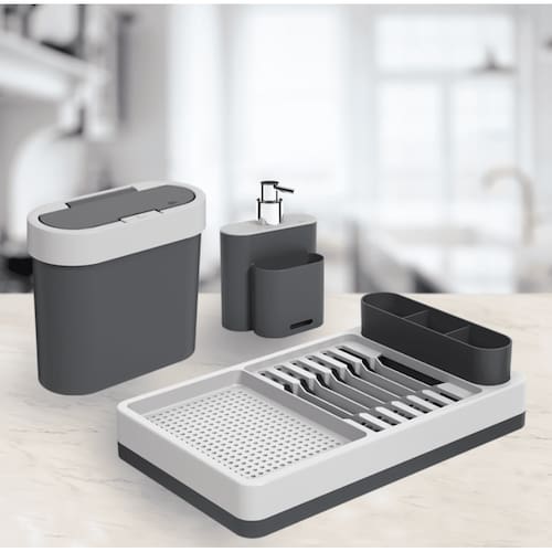 DIFERENCIAIS: o kit possui design sofisticado e moderno com cantos arredondados. O dosador de detergente líquido tem na parte frontal suporte para esponja e abertura para escoar o excesso de água. O Escorredor de Louças Flat tem formato compacto e a bandeja inferior além de deixar a bancada da pia seca, pode ser usada separadamente. A Lixeira Press Flat tem formato que encaixa o prato e facilita o descarte, tampa que esconde a sacola, abertura com um click e capacidade para 2,8L.
