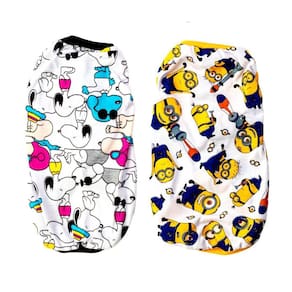 Kit Pijama para cachorro estampa minions e snoopy - tamanho M - pijama confeccionada em malha pv poliéster com viscose na cor branca; - estampa temática dos personagens minions e snoopy; - acabamento em cotton preto; Medidas aproximadas: - TAMANHO M: Pescoço: 26 cm de circunferência Abdômen / torax: 38 cm de circunferência Comprimento: 36 cm Além de muito confortável e lindo, deixará seu pet ainda mais charmoso. Marca: Não Informado