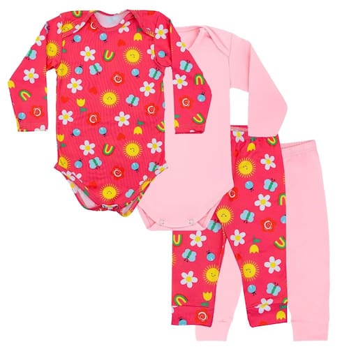 O Kit pijama térmico Bebê com 2 Bodies e 2 Calças Jardim Encantado Vermelho é confeccionado em malha Energy Up Thermo Dry com tecnologia térmica que absorve melhor o suor, deixa a bebê confortável, aquecida e com a temperatura mantida. É o kit de pijama ideal para o inverno. Os bodies possuem botões de pressão entre pernas.