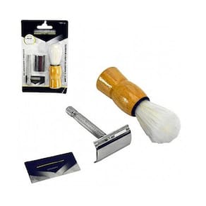 Aparelho de Metal resistente; Cabo antideslizante; Cabeça removível; Seguro e confortável; Reutilizável; Lâminas duplo fio; Pincel em madeira.