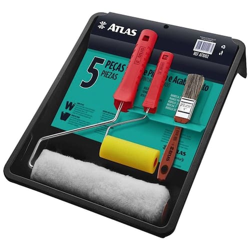 Descrição do produto : Kit 5 peças com bandeja, trincha 1 1/2 cerdas gris, rolo espuma 9cm, garfo e rolo de lã de ploliéster de alta densidade de 23cm.