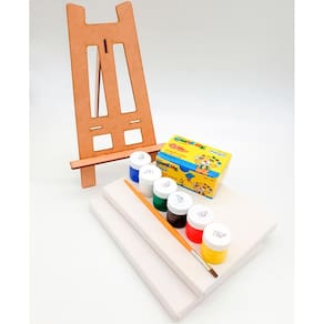 - 01 Mini Cavalete com 24,7cm de Altura x 13,6cm de Largura x 18,5 cm de profundidade - 02 Telas Grampeadas, medidas 15X20 - 01 Caixa com 06 Tintas Guache 06 cores - 01 Pincel