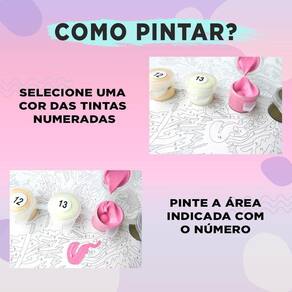 Instruções: Para pintar é muito fácil Adesive as suas tintas de acordo com o Guia para as tintas; Desenrole a tela em um local plano; Molhe os pincéis na água; Abra o potinho de tinta; Molhe o pincel com um pouco de tinta; Pinte a área indicada com a numeração do potinho de tinta; Preencha a tela com todas cores;