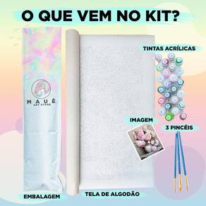 Características: - Kit completo para sua nova obra de arte, incluindo seus acessórios; - Tela de algodão 100% tecido, com superfície canvas premium para pintura; - Peso dos kits: aproximadamente 200g; - Pode haver variação de tonalidade de cor das tintas; - Moldura não inclusa