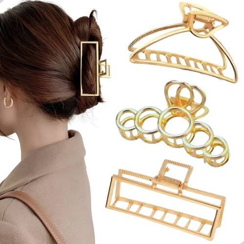 3 piranhas de cabelo grandes em metal ultra resistente douradas, perfeitas para todos os tipos de cabelo.