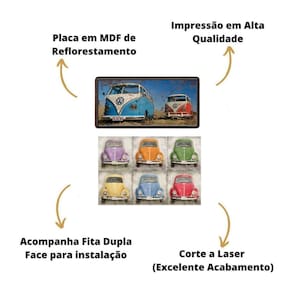 Dimensões: kombis: 30cm x 20cm fuscas: 30cm x 15cm Espressura: 0,3cm Fabricado com 100% madeira de reflorestamento; Acompanha fita dupla face para instalação; Estampa impressa em adesivo de alta resistência; Design moderdo e elegante;
