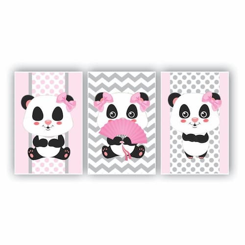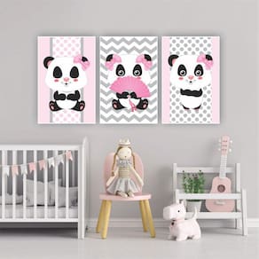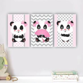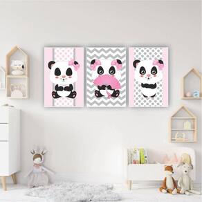 Kit Placas Quadros 3 Pçs 20X30 Infantil Panda Rosa