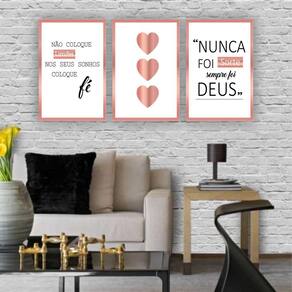 Kit Placas Quadros Decorativos Sala 3 20X30 Religioso Nunca Foi Sorte Kit 3 quadros decorativos mosaicos Material: Quadros decorativos produzido em mdf - medidas por peça: 1 peça de 30x20cm 1 peça de 30x20cm 1 peça de 30x20cm Medida total do quadro instalado 60x30cm - informações técnicas: O quadro não precisa de moldura, estão pronto para pendurar na parede. São feitos em adesivos fosco e impressos em alta qualidade. Aplicado em mdf com espessura de 3mm. Não é necessário furar a parede para instalação, pois, enviamos fitas 3m com grande poder adesivo para facilitar a instalação. É necessário na hora da instalação posicionar o quadro em 1cm de largura entre eles para melhor qualidade de visualização. - instalação: Limpe o local que vai ser instalado o quadro com um pano úmido, após secar o local, visualize como Vai ser o alinhamento, e retire a proteção da fita dupla face parte verde da fita e pressione No lugar desejado para a fixação. - limpeza após fixação: A limpeza pode ser realizada apenas com um pano seco macio, se desejar pode ser úmido Porém sem conter álcool ou produtos químicos. -tem a Sim, todos os nossos produtos estão à Marca: Não Informado Ean: 1001001058976