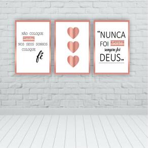 Kit Placas Quadros Decorativos Sala 3 20X30 Religioso Nunca Foi Sorte Kit 3 quadros decorativos mosaicos Material: Quadros decorativos produzido em mdf - medidas por peça: 1 peça de 30x20cm 1 peça de 30x20cm 1 peça de 30x20cm Medida total do quadro instalado 60x30cm - informações técnicas: O quadro não precisa de moldura, estão pronto para pendurar na parede. São feitos em adesivos fosco e impressos em alta qualidade. Aplicado em mdf com espessura de 3mm. Não é necessário furar a parede para instalação, pois, enviamos fitas 3m com grande poder adesivo para facilitar a instalação. É necessário na hora da instalação posicionar o quadro em 1cm de largura entre eles para melhor qualidade de visualização. - instalação: Limpe o local que vai ser instalado o quadro com um pano úmido, após secar o local, visualize como Vai ser o alinhamento, e retire a proteção da fita dupla face parte verde da fita e pressione No lugar desejado para a fixação. - limpeza após fixação: A limpeza pode ser realizada apenas com um pano seco macio, se desejar pode ser úmido Porém sem conter álcool ou produtos químicos. -tem a Sim, todos os nossos produtos estão à Marca: Não Informado Ean: 1001001058976