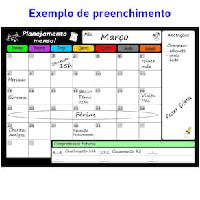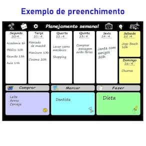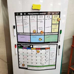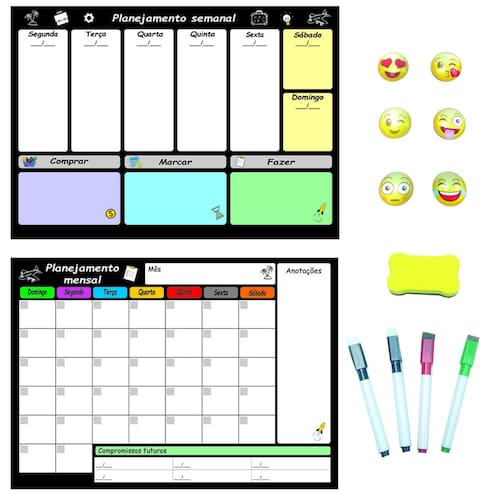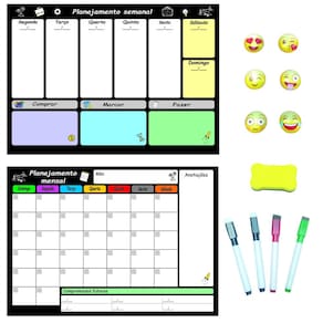 Kit com dois quadros magnéticos para marcação de compromissos, sendo um semanal e um mensal.O quadro de planejamento mensal é uma ferramenta prática para marcação de compromissos ao longo do mês e até de meses seguintes, pois possui espaço extra para isto.Já, o quadro semanal, é muito útil para programar as atividades mais imediatas da semana que começa.Estes quadros são especialmente úteis quando colocados na geladeira, um local de fácil acesso e visibilidade na maioria das casas. Ele ajuda a organizar os compromissos, eventos e tarefas importantes de maneira visual e intuitiva. A parte de trás de cada quadro é totalmente coberta por manta de imã super aderente. Juntamente, são enviadas duas canetas preta de ponta fina com borracha tipo espuma na ponta. Ela também possui um imã em seu corpo, o que permite sua fixação na geladeira. Caso a tinta acabe, esta caneta pode ser facilmente encontrada em qualquer papelaria. Conteúdo:- 1 quadro magnético semanal (29,5cm x 40cm)- 1 quadro magnético mensal (29,5cm x 40cm)- 2 canetas preta para quadro branco com imã e apagador - 1 caneta verde para quadro branco com imã e apagador - 1 caneta vermelha para quadro branco com imã e apagador - 6 emoticons magnéticos em vidro - 1 apagador com imã