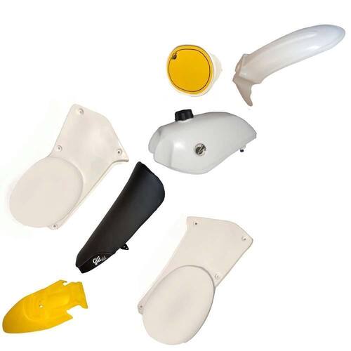 A Gilimoto produziu uma versão para trilha e motocross que retrata o estilo das saudosas e queridas motocicletas dos anos 70. É a versão old cross batizada pela Gili desenvolvida a partir do quadro de uma honda crf 230 e que tem a versatilidade de ser adaptado em outros quadros, com o auxílio de um bom mecânico. Kit Branco com Amarelo O que acompanha o kit: 01 paralama dianteiro old cross gili - branco 01 paralama traseiro old cross gili - amarelo 01 par de laterais old cross gili - branco sem adesivos 01 banco preto old cross gili 01 tanque old cross gili - branco 01 number plate old cross gili - branco com adesivo poderá ser enviado o adesivo na cor branco, preto, amarelo ou verde 01 suporte para tanque old cross gili 01 jogo de ferragens para fixação do kit plástico old cross gili Produzido no Brasil por Gilimoto Designs. Produzido com plástico de alta flexibilidade e resistência com pigmentos a prova de raios ultra violeta. A moto não acompanha o kit. A moto não está a venda. Marca: Não Informado