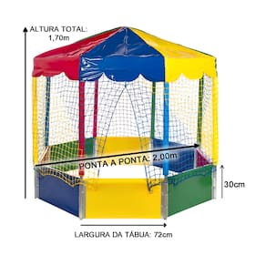 PISCINA DE BOLINHAS OITAVADA 2,00m MEDIDAS (VALORES APROXIMADOS): Largura:2,00m Altura total: 1,70m Comprimento: 2,00m Altura da tábua lateral: 30cm ESPECIFICAÇÕES: Estrutura em aço galvanizado; Acessórios com proteção UV; Rede de proteção em polipropileno; Sistema de montagem por encaixe; Revestida com isotubos blindados.