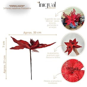 Kit Poinsettia Vermelha Bico De Papagaio 30cm Enfeite Natal Flor Poinsettia Artificial Vermelha com Glitter Inigual Decor Adicione um toque de cor vibrante e brilho festivo à sua decoração com esta linda Flor Poinsettia Artificial Vermelha da Inigual Decor. A poinsettia é um símbolo clássico do Natal, e esta versão artificial captura toda a sua beleza com um acabamento em glitter que traz um charme extra e um brilho especial para qualquer ambiente. Feita com uma combinação de metal, plástico e poliéster, esta flor é leve, durável e perfeita para diversas aplicações decorativas. Seu caule flexível permite que seja facilmente inserida em arranjos florais, guirlandas, árvores de Natal ou Utilizado para criar pontos de destaque em sua mesa ou lareira. É a peça ideal para quem busca uma decoração que une praticidade e a tradição natalina de forma elegante. Por Que Escolher a Poinsettia Inigual Decor Design Festivo: A cor vermelha intensa e o acabamento em glitter criam um visual clássico e luxuoso. Material Resistente: A combinação de metal, plástico e poliéster garante a durabilidade da peça. Fácil de Usar: O caule flexível permite que a flor seja adaptada para diferentes tipos de decoração. Símbolo de Natal: A poinsettia é um ícone natalino que traz o espírito da época para sua casa. Especificações do Produto: Material: Metal, Plástico e Poliéster Cor: Vermelha Conteúdo da Embalagem: 3 Flores Poinsettia Artificial Altura Total: 28,0 cm Altura do Caule: 21,0 cm Diâmetro da Flor Aberta: 30,0 cm Peso Aproximado: 35 g Observação: As imagens são ilustrativas. Itens decorativos adicionais exibidos nas fotos não acompanham o produto. Vem decorar, seja INIGUAL Marca: Não Informado