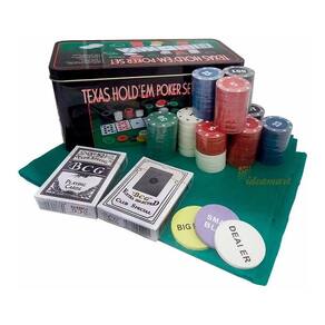 É o mais popular de uma classe de jogos nos quais os jogadores com as cartas total ou parcialmente escondidas fazem apostas para um monte central, após o que o resultante das apostas é atribuído ao jogador ou jogadores que possuir o melhor conjunto de cartas dentre os que permaneceram na mão, ou ao jogador restante caso os outros tenham desistido. Lata decorada para transporte e armazenamento 40x fichas brancas valor 1 40x fichas vermelhas valor 5 40x fichas verdes valor 10 40x fichas azuis valor 25 40x fichas pretas valor 50 2 baralhos 1 botão dealer 1 botão small blind button 1 botão big blind button 1 tapete de jogo em feltro 87x58cm 1 suporte de fichas 1 instrução de uso. Obs: nao vendemos fichas separadamente