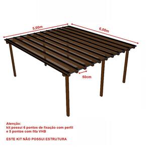 5,00m de largura x 6,00m de avanço (sentido da caída da água)11 caibros/travessas (espaçamento de 50cm)caimento de 10%Considerando 6 pontos de fixação