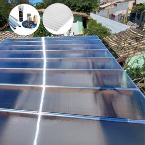 O kit não possui estrutura. Antes do uso as chapas devem ser armazenadas sobre uma superfície plana e protegidas de luz solar direta, chuva e ventoCurvatura a frio somente no sentido dos alvéolos Recomenda-se não furar a chapa devido ao grande coeficiente de dilatação do policarbonatoO filme de proteção indicando o lado do UV deve ficar para cima e precisa ser removido imediatamente após a instalação