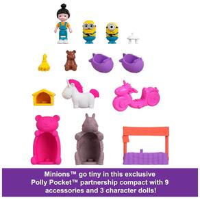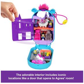 Este adorável compacto combina o icônico exterior dos Minions com cabelos tufados rosa e se abre para revelar a casa de Gru em miniatura. O conjunto inclui duas figuras dos Minions, Bob e Carl, além da microboneca Agnes, permitindo aos fãs recriar suas cenas favoritas de "Meu Malvado Favorito".