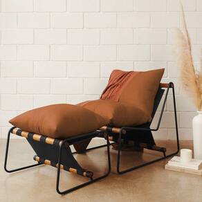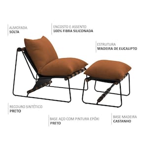 Estrutura: Madeira reflorestada de eucalipto tratada, com partes em MDF e OSB. Assento e Encosto: Fibra siliconada. Revestimento: Poliéster com detalhes em recouro. Base: Aço com pintura epóxi e madeira de eucalipto envernizada. Puff: Fibra siliconada, revestimento em poliéster com detalhes em recouro.Vendido e entregue por WebContinental