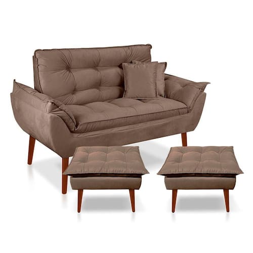 Kit Poltrona Decorativa Namoradeira 2 Puffs Opala e 2 Almofadas Suede Cappuccino - LM Decor