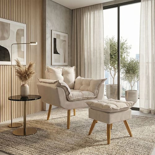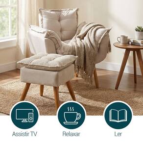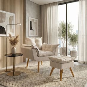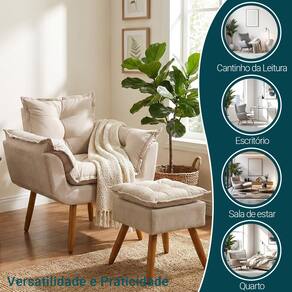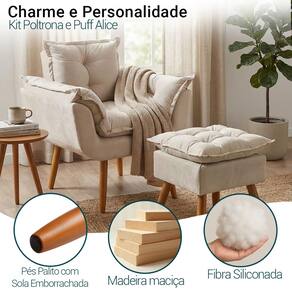 Kit Poltrona e Puff Alice Decorativa Confortável Para Sala Recepção Manicure Quarto Consultório Tecido Suede - Bege