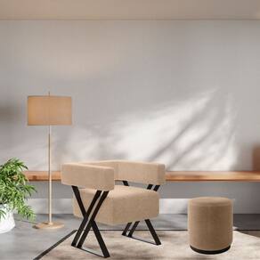 Poltrona/Puff Estrutura: Madeira Eucalipto Puff Densidade da Espuma: Assento D-26 Poltrona Densidade da Espuma: Assento D-26 Encosto D-18 Tecido: Bouclé ou Linho. Material dos pés: Metal com Pintura Eletrostática. Instruções de Limpeza: Utilizar um pano limpo e levemente úmido. Você irá receber: 02 volumes.