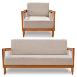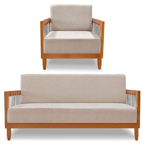 Kit Poltrona E Sofá Living 2 Lugares Marilia 1,60m Linho Base Em Madeira Castanho - Pallazio Cor Areia