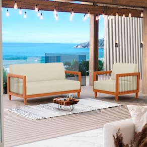 Madeira maciça, Linho, Corda Náutica, Espuma HR, Plumante de SiliconeQue tal o Conjunto de Poltrona e Sofá Varanda Samoa Madeira Maciça com Cordas Náutica?